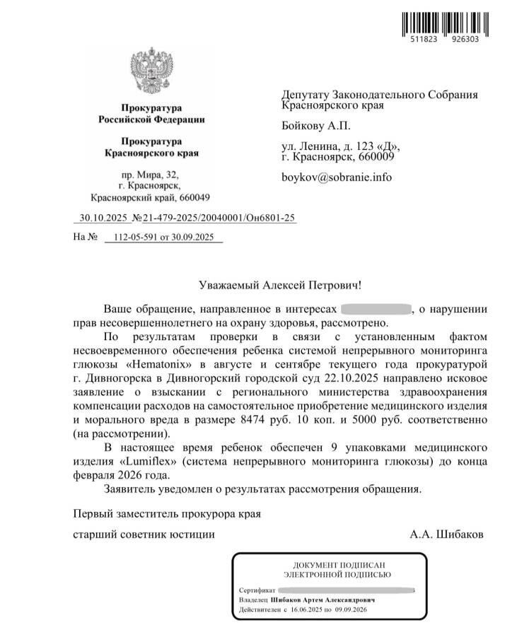 Сейчас, по данным прокуратуры, ребенка обеспечили системами мониторинга до конца февраля 2026 года.