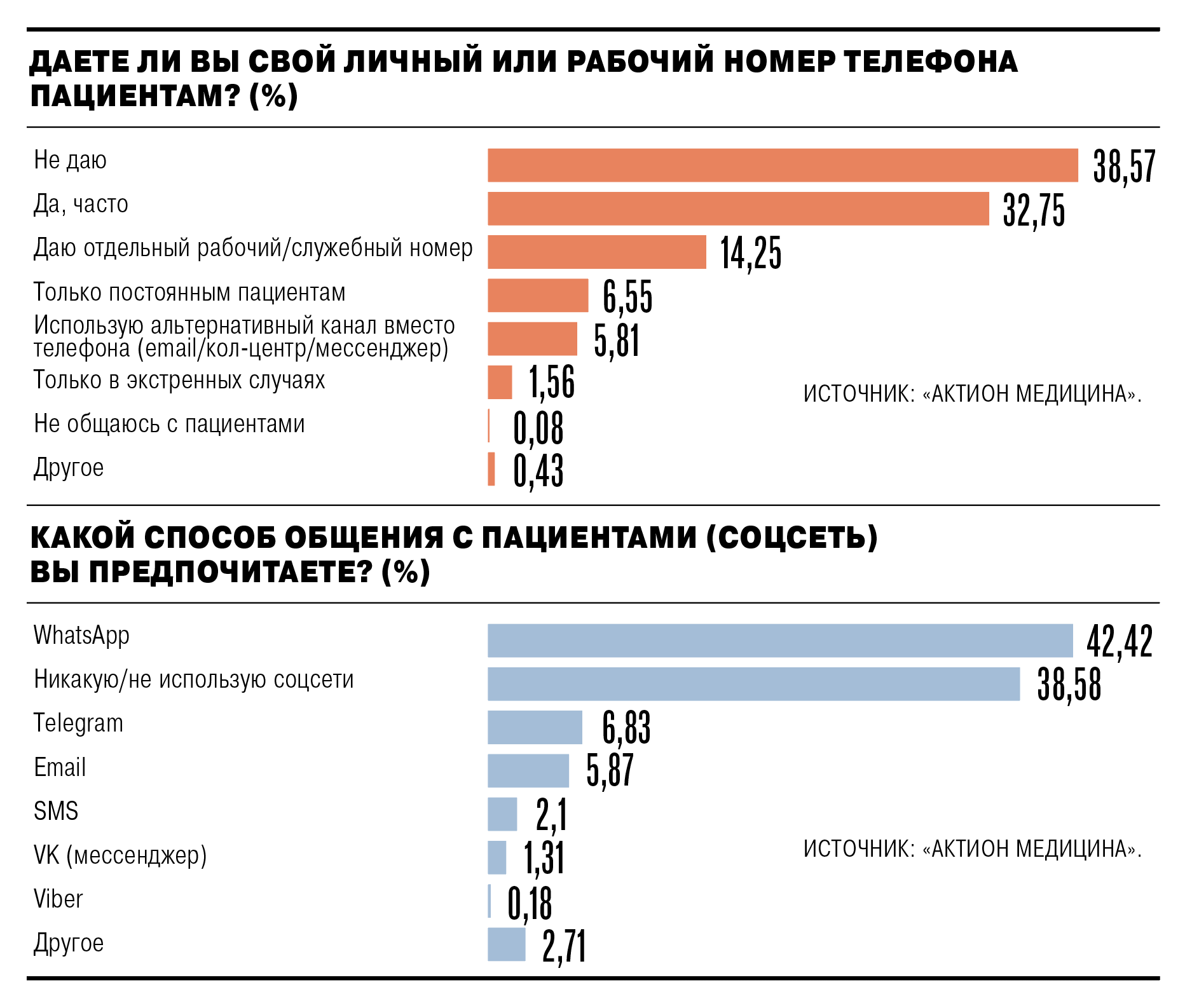 Профессиональный сервис «Актион медицина» опросил 1,2 тыс. врачей о том, как они взаимодействуют с пациентами и коллегами в нерабочее время. Выяснилось, что каждый третий врач (32,7%) часто дает пациентам личный номер телефона или контакт в мессенджере, чтобы оперативно проконсультировать о лечении. Еще 6,5% делают это «время от времени». Однако 38,5% медиков категорически не готовы делиться контактами, а 14,25% используют для этого отдельный телефонный номер.